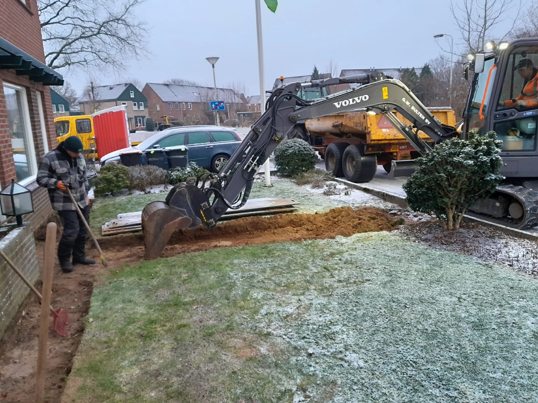 Het team staat af en toe klappertandend te genieten van de werkzaamheden – momenteel nog hartje winter.